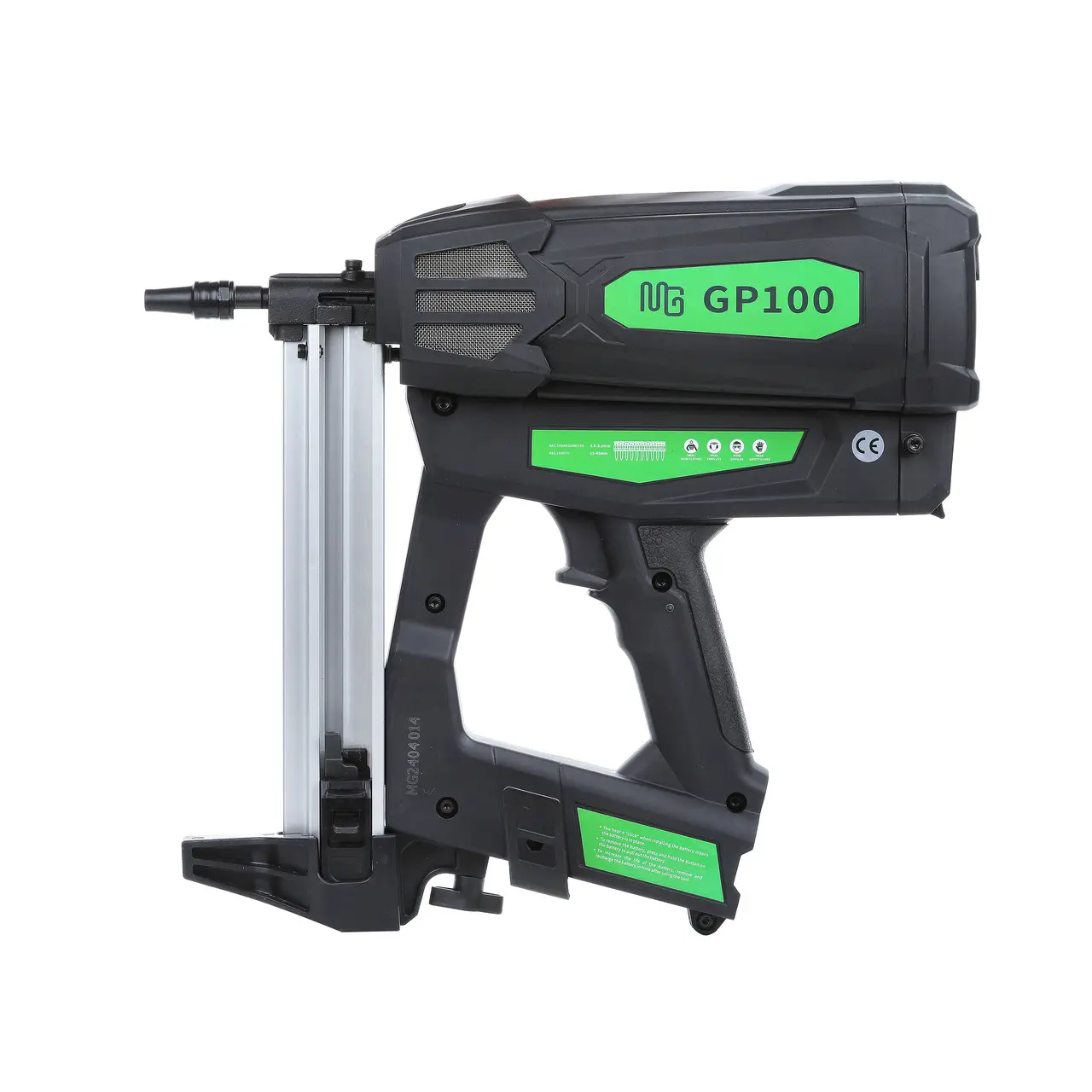 MG GP 100 енергія удару 100 Дж. Завдяки високій енергії пострілу підходить для більшості крупносерійних монтажних робіт, а тонкий "носик" додає зручності при электормонтажных роботах. Вага 3,6 кг